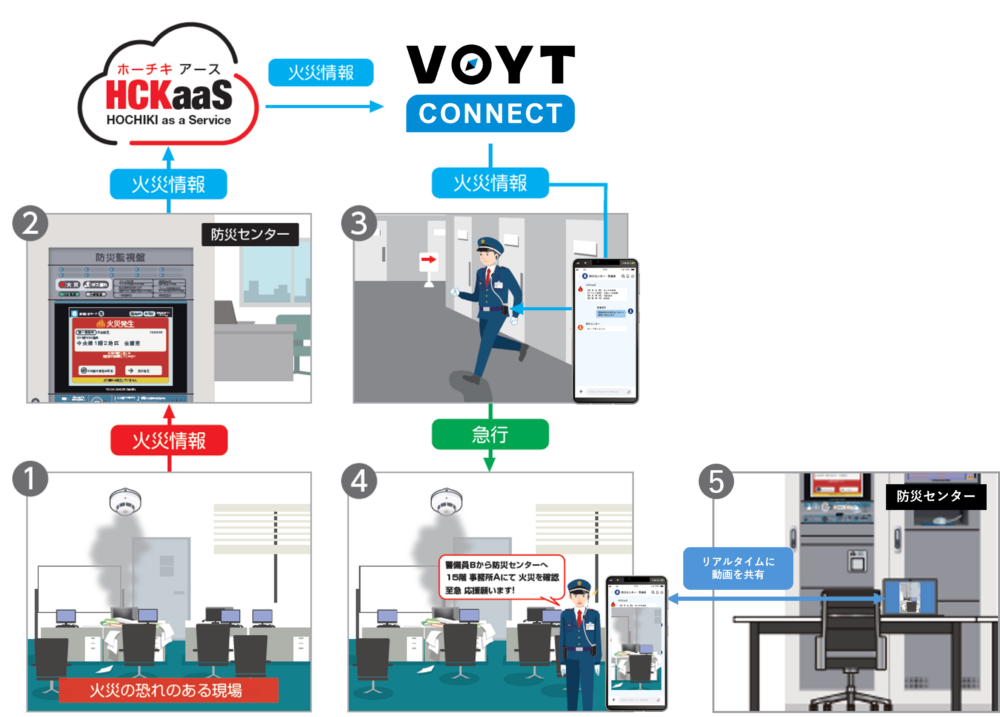 ボイット株式会社(本社:東京都渋谷区、代表取締役社長 CEO:永冨 泰高、以下:当社)は、2025年12月に開催される建築・土木・不動産の先端技術展示会「第10回JAPAN BUILD TOKYO」において、ホーチキ株式会社(本社:東京都品川区、代表取締役社長執行役員:細井 元、以下:ホーチキ社)のブース内にて、ホーチキ社の防災クラウドサービス「HOCHIKI as a Service(以下:HCKaaS(ホーチキアース)」と当社のAIインカムアプリ「VOYT CONNECT(以下:ボイットコネクト)」の映像通報ソリューションの連携システムを初展示します。